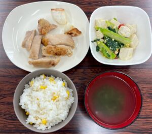 Funはカブと鶏もも肉のソテー、コーンバターライス、サラダ、スープ。