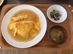 ふぁんふぁんは天津飯、しめじと小松菜の和え物、えのきの味噌汁。